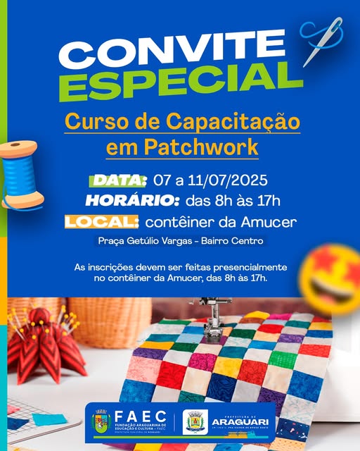 Por meio da Faec, em parceria com a Amucer, convida você para participar do Curso de Capacitação em Patchwork: uma oportunidade gratuita de aprendizado, qualificação e geração de renda.