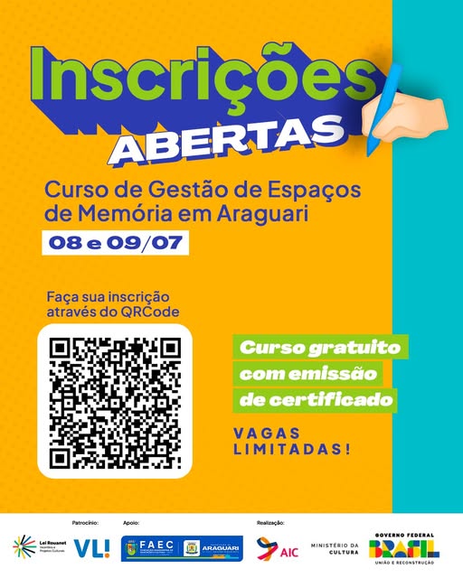 A Prefeitura Municipal de Araguari, em parceria com a FAEC, tem o prazer de divulgar que estão abertas as inscrições para o Curso de Gestão de Espaços de Memória, que acontecerá nos dias 8 e 9 de julho de 2025, em formato híbrido (presencial e remoto).